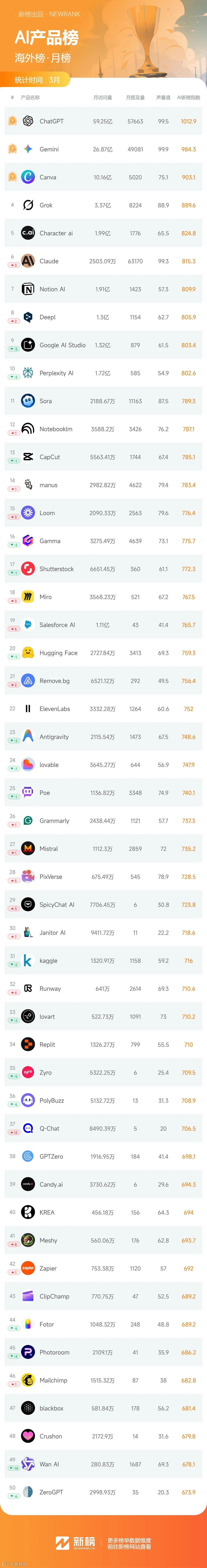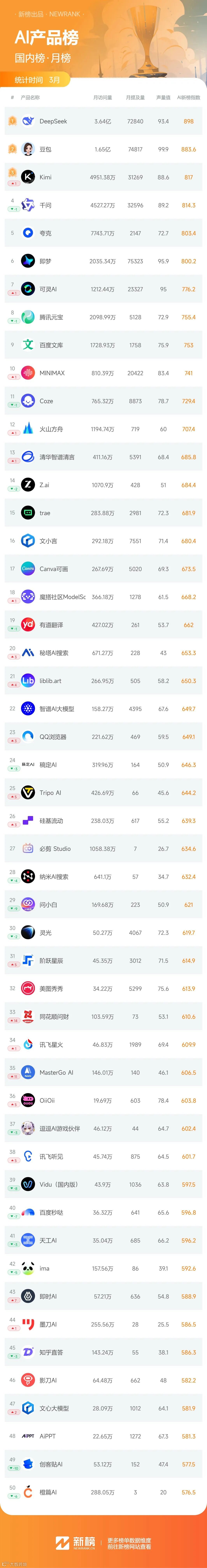 AI新榜-AI产品榜月榜第23期已发布,统计周期为2026年3月1日至31日,涵盖总榜、国内榜与海外榜三大维度。