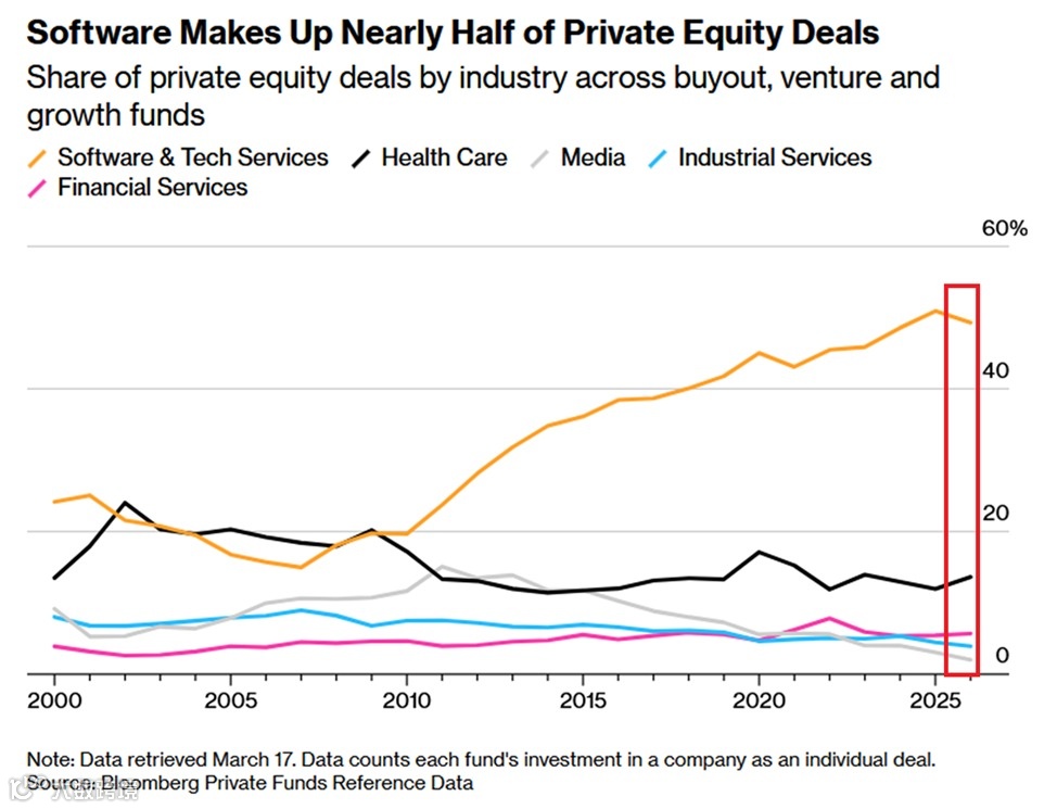 当AI能以近乎零成本快速发现利用漏洞,这两点基础同时崩塌。私募数据显示,美国49%的股权交易押注软件服务公司,显著高于医疗行业14%的占比。