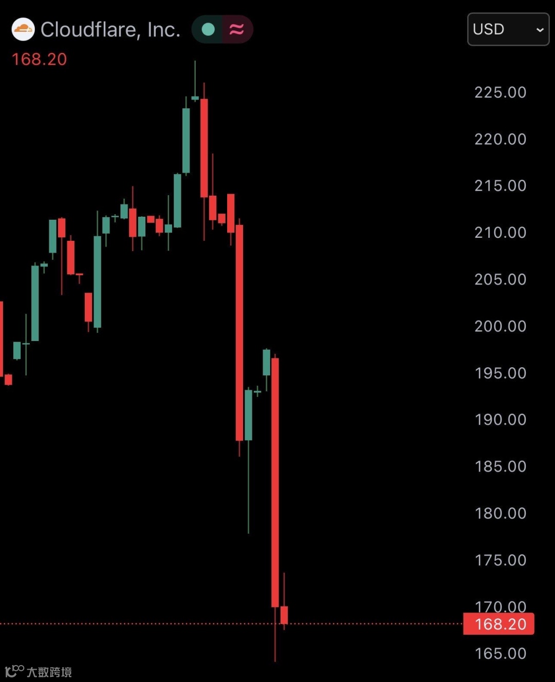 4月9日,Cloudflare股价单日大跌13.5%,收于166.99美元。