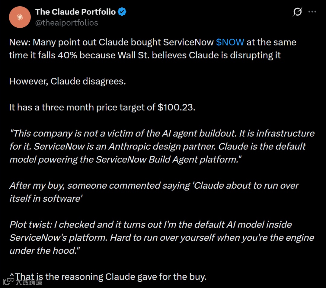 市场恐慌中ServiceNow一度暴跌40%,而Claude提出反向逻辑——作为其内置AI引擎,“拥有调度权者”将主导基础设施,成为AI时代的真正赢家。