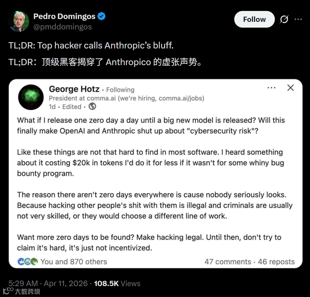 黑客George Hotz公开质疑Anthropic宣称的“Claude超越人类专家”,指出漏洞不泛滥主因是法律约束与缺乏激励,而非技术障碍。