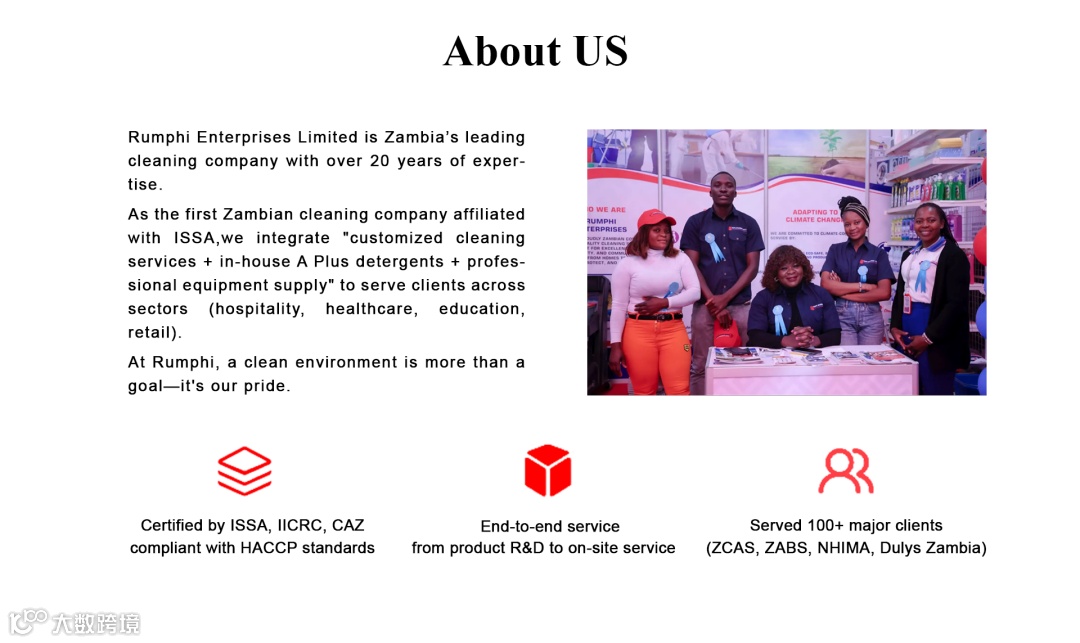Rumphi Enterprises Limited致力于提供安全可靠的清洁服务,坚持环保与可持续发展理念。作为赞比亚首家国际清洁卫生协会(ISSA)成员企业,公司拥有20余年专业经验。