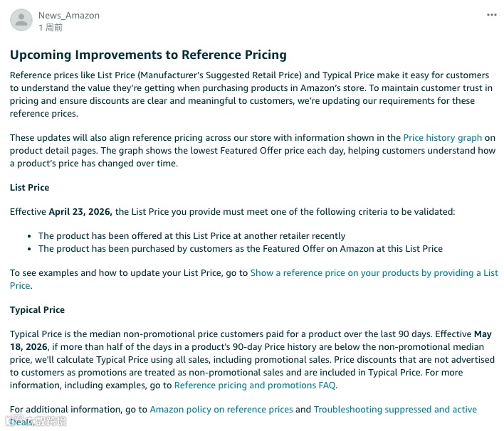 新规对常规价(Typical Price)的计算方式做出重大调整:若商品在过去90天内,以低于非促销中位价销售的天数超过45天,系统将自动把该促销价纳入常规价计算范围,进而拉低商品的价格基准。