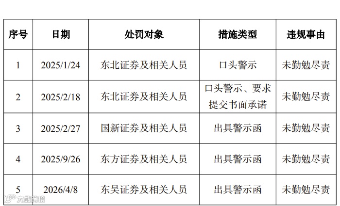 《关于对会员及其他交易参与人采取自律监管措施的情况公示》涉及东北证券、国新证券、东方证券、东吴证券,其中东北证券被两次采取自律监管措施。5家次券商的违规事由均为未勤勉尽责。措施类型方面,东北证券及相关人员一次被采取口头警示、第二次被采取口头警示、要求提交书面承诺,国新证券、东方证券、东吴证券则均为出具警示函。采取自律监管措施的时间从2025年1月24日到2026年4月8日,跨度比较长。