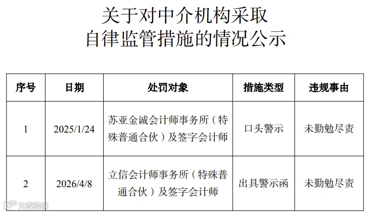 《关于对中介机构采取自律监管措施的情况公示》涉及两家会计师事务所。苏亚金诚会计师事务所(特殊普通合伙)及签字会计师、立信会计师事务所(特殊普通合伙)及签字会计师,违规事由均为未勤勉尽责,措施类型分别为口头警示、出具警示函。