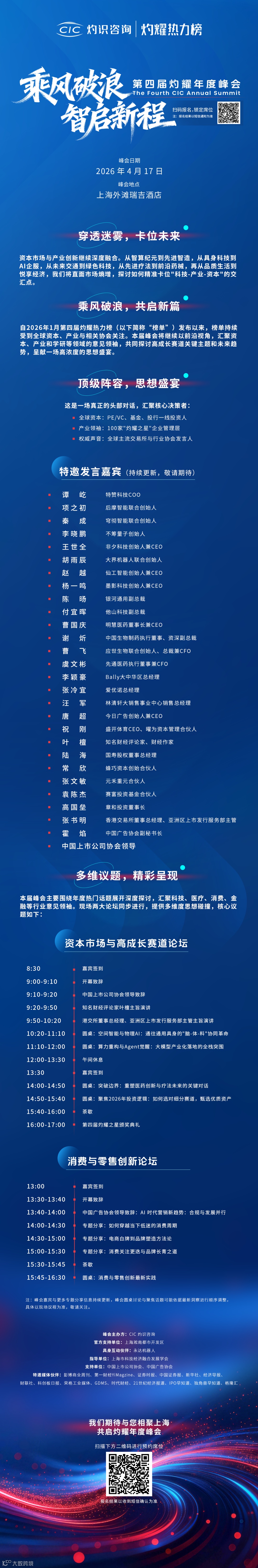 灼耀峰会(以下简称“峰会”)是由 CIC 灼识咨询主办的年度旗舰品牌活动,全称为"灼耀年度峰会暨颁奖盛典",旨在探讨变革时代的新质生产力发展,为创新企业提供展示舞台,打通信息壁垒,链接多方资源,促进产业与资本融合。峰会面向创新企业、投资机构、产业链上下游生态伙伴,致力于提升行业生态系统整体价值,已成为中国新经济与创投领域具有重要影响力的年度盛会。自2023年首届灼耀年度峰会暨颁奖盛典举办以来,累计触达近2,000位来自金融、科技、消费、医疗等⾏业机构⾼管与创始⼈,及监管与产学投研部门领导与发言人。