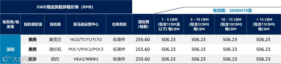 - 跨境海运费用(人民币计费):适用于深圳GWD仓至美国FBA的海运拼箱服务