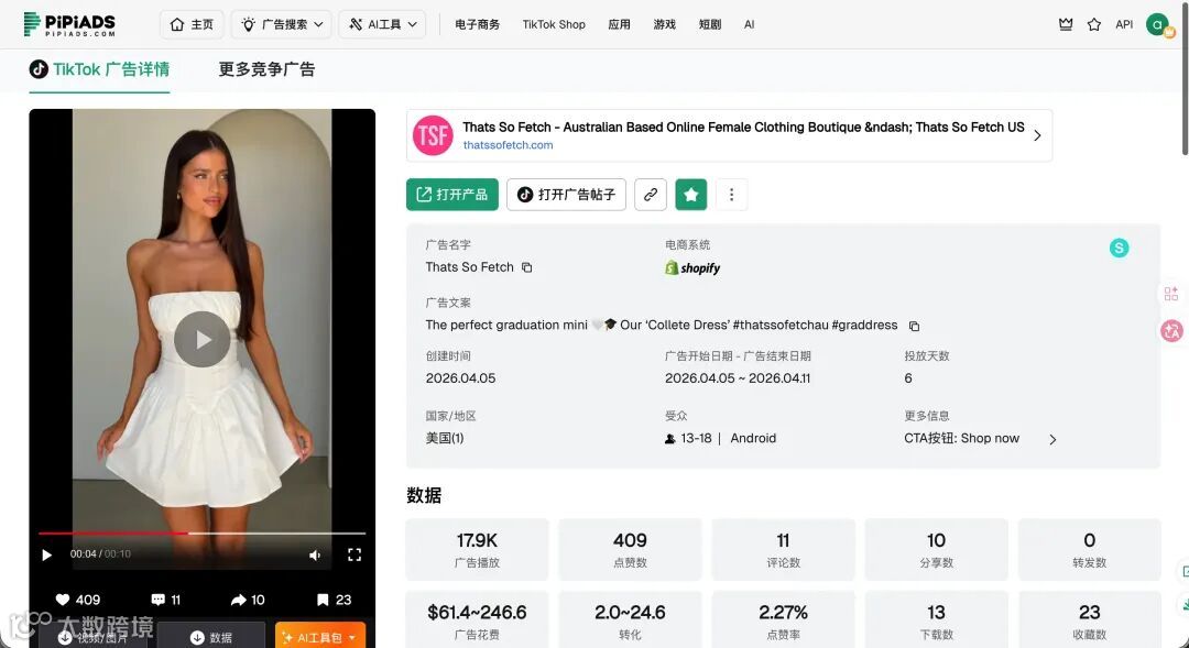 毕业季营销典型案例,"The perfect graduation mini"精准锁定场景需求。澳大利亚品牌(thatssofetchau)借势五月毕业季投放高峰,印证服装爆单逻辑:场景+季节节点+情绪共鸣。