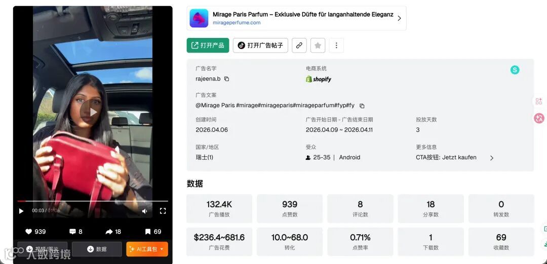 高客单价香水品类依托「本地博主实测+高端视觉呈现」策略。德语市场(DACH)竞争度低于英语区,利润空间可观。要点:真人场景化演示、简约高端画面设计、降低广告突兀感。