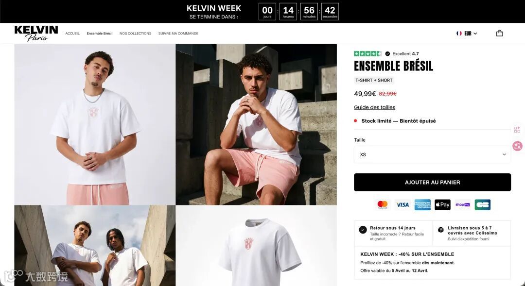 法语市场服装套装成功结合法系时尚调性与"免运费"钩子。法国/比利时/瑞士用户对本土化品牌(如含"Paris"名称)认同度高。要点:欧洲小语种市场竞争较小,投入产出比更优。