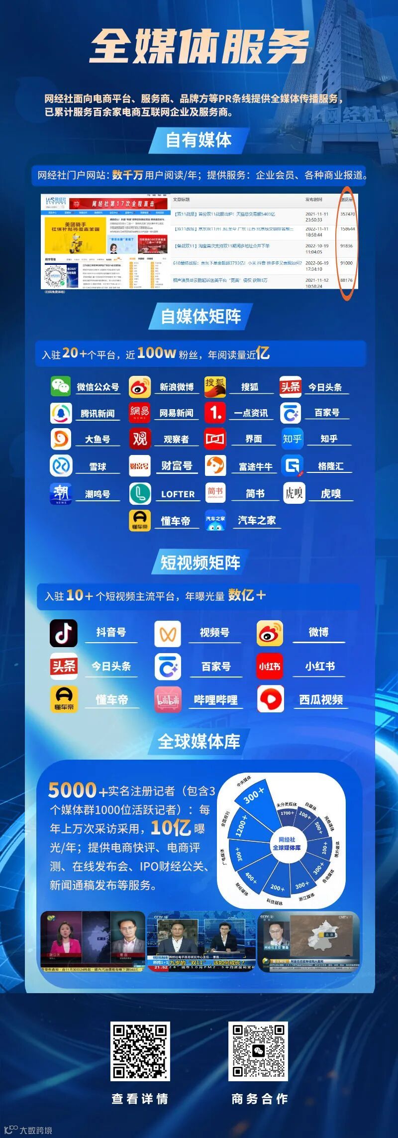 网经社深耕数字经济19年,为数字经济产业链提供三条业务线服务。其中媒体服务(即“卖字”)基于网经社自有媒体(数字经济门户网站,数千万高质量用户阅读/年)、自媒体矩阵(图文+短视频,近30个平台,近100万优质粉丝群体,年阅读量数亿+)、5000+注册记者(每年上万次全球各类媒体采用,10亿+曝光/年),面向电商平台、头部服务商等PR条线提供媒体传播服务。