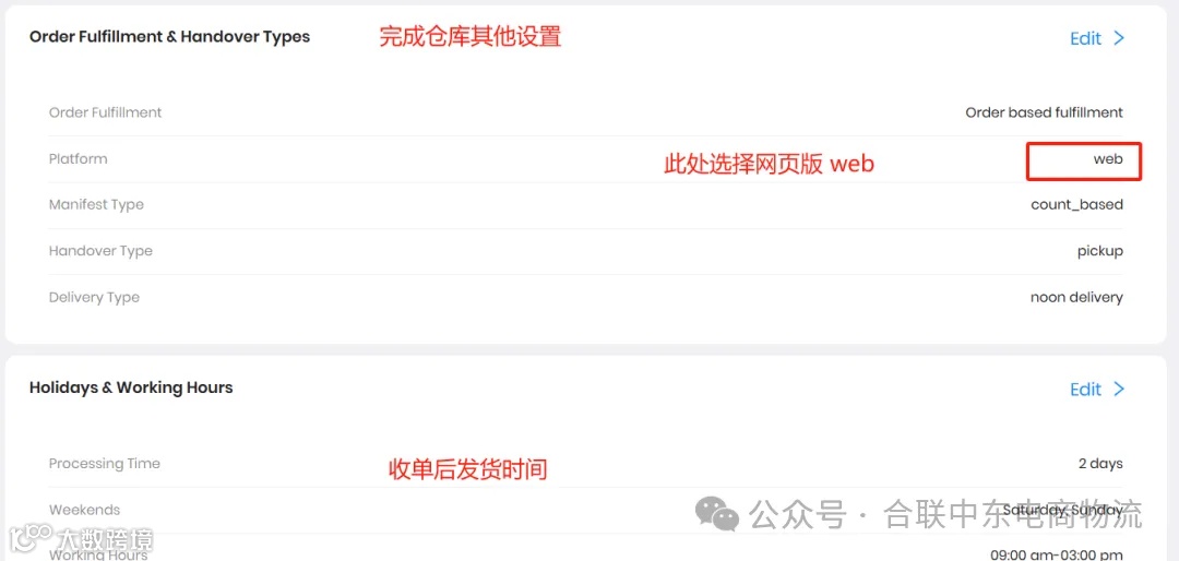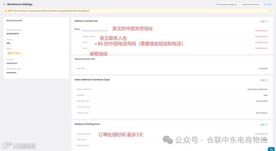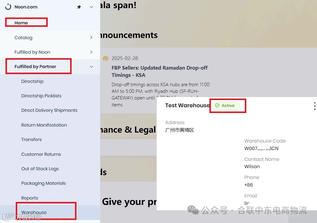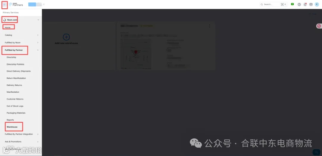 进入路径:左上角三条杠 (菜单)> Noon.com > FBP >「仓库(Warehouse)」>「添加仓库(Add Warehouse)」;