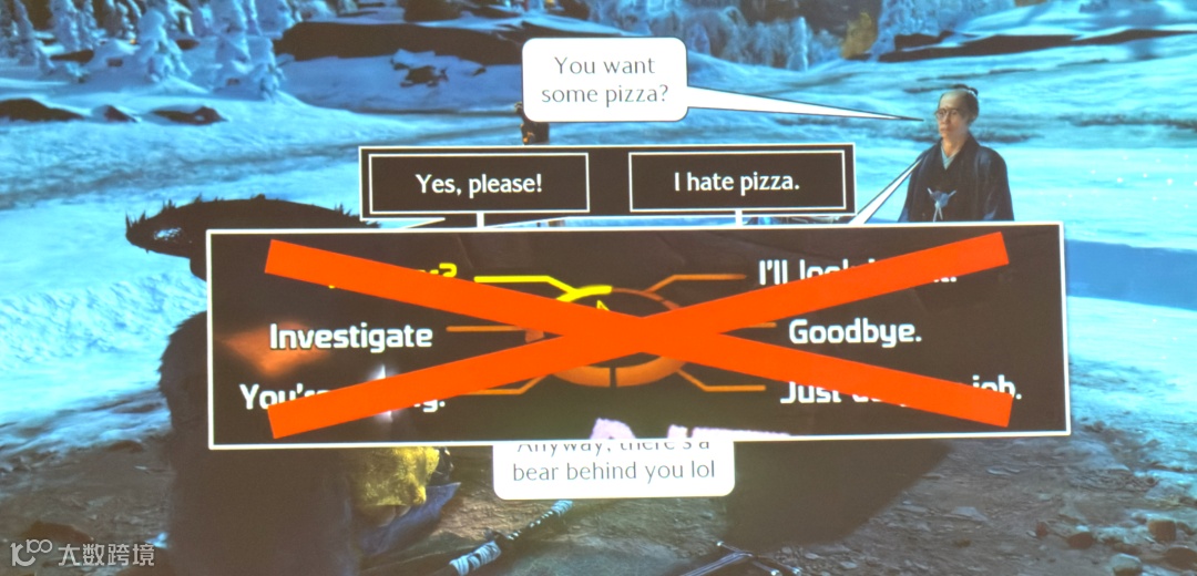 不过有一点需要明确,我们不是《博德之门》(Baldur's Gate),也不是《质量效应》(Mass Effect),没打算做复杂的动态网状系统:如果你玩过这款游戏,那见过最多的对话选项,估计就是两个分支的回答,这些回答没有实质性的影响,很快就会回归主线。