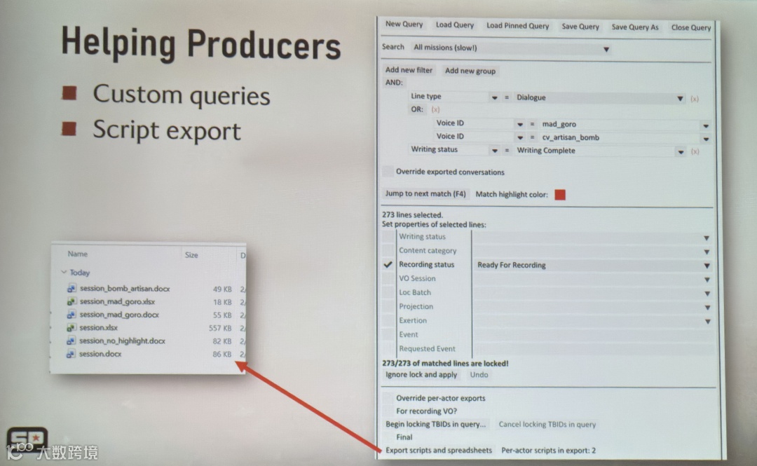 另外,我们还为录音环节做了自定义导出功能。我们每次录音要准备很多版本的材料:演员一份、导演一份、录音棚各种角色各一份……以前这些全靠手工整理,现在制作人只要设定好查询条件,就能一键导出所有格式,可以省掉大量重复工作。
