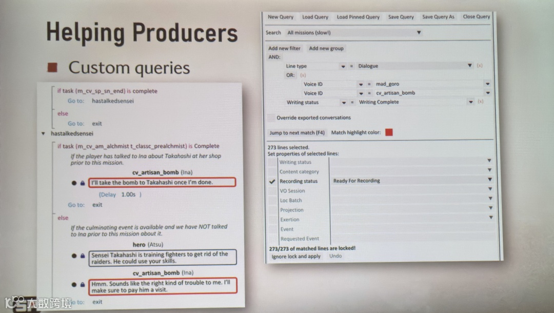 策划可能在Perforce里删了一句台词,但Google Docs和数据库没更新;编剧可能在文档里加了台词,但没进数据库……最坏的情况是,一些台词已经在游戏里删了,但其他人不知道,把这些废台词送去录音、本地化后才会发现,最后钱白花了。