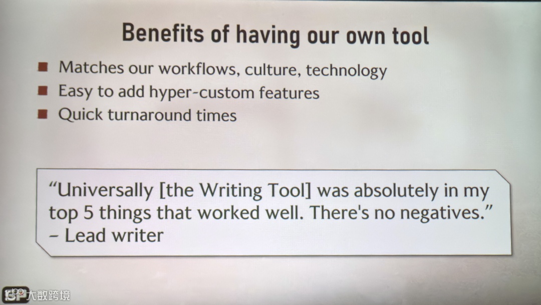 最后,我们对这些外部工具的控制力很有限:在Google Docs没有发言权,台词数据库又是索尼内部的小团队负责,他们无法及时响应我们的定制化需求。