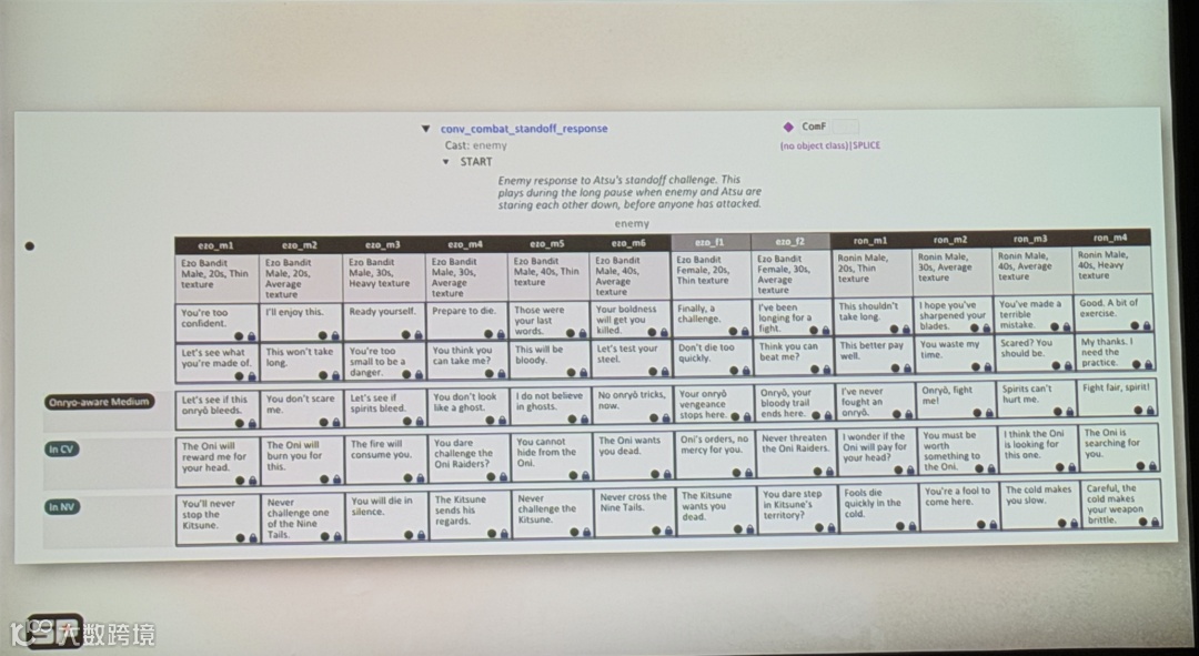 在开发《羊蹄山之魂》的四年中,我们产出了约15万字对话和5万字文本素材。这其中,有75%是任务专属对话,玩家只会听一次;剩下25%是系统性对话(Systemic dialogue),比如战斗呼喊、商人叫卖、背景村民闲聊,可以在多个场景里重复播放。