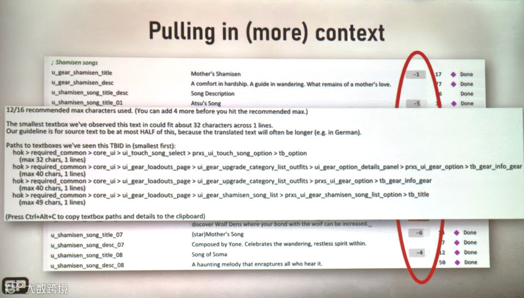 工具读取这些数据后,会在编剧写UI文本时给出视觉提示(胶囊图标)。灰色代表字数安全,红色代表超长,翻译成其他语言可能会爆框——这既帮了编剧控制篇幅,也反过来帮UI团队排查了哪些文本框的限制设得过严。