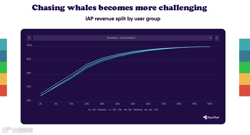 收入模式正在转变:开发者越来越难将用户转化为付费玩家。只有不到5%的玩家会进行游戏内购,收入越来越依赖"鲸鱼用户"(高消费用户)。但这一群体也已出现下滑迹象,特别是在iOS平台,贡献占比下降了12%。
