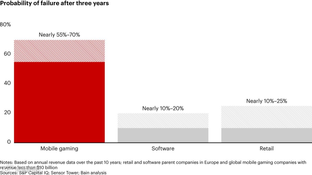当前,全球游戏发行格局既充满挑战,也令人振奋。先从挑战入手,让大家更直观地理解行业难度。根据Bain的分析,移动游戏研发与发行的风险水平是软件行业和零售行业的4到5倍。