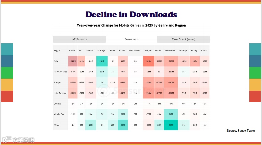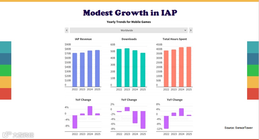 内购收入温和增长,但下载持续下降:2025年,游戏内购收入达到817.5亿美元,同比增长1.3%;但游戏下载量持续两年下滑,2025年下降7.2%,至504.1亿次。不过,用户在游戏中的停留时长还在持续增长,2025年同比提升0.9%。这说明获取新用户正变得越来越困难。