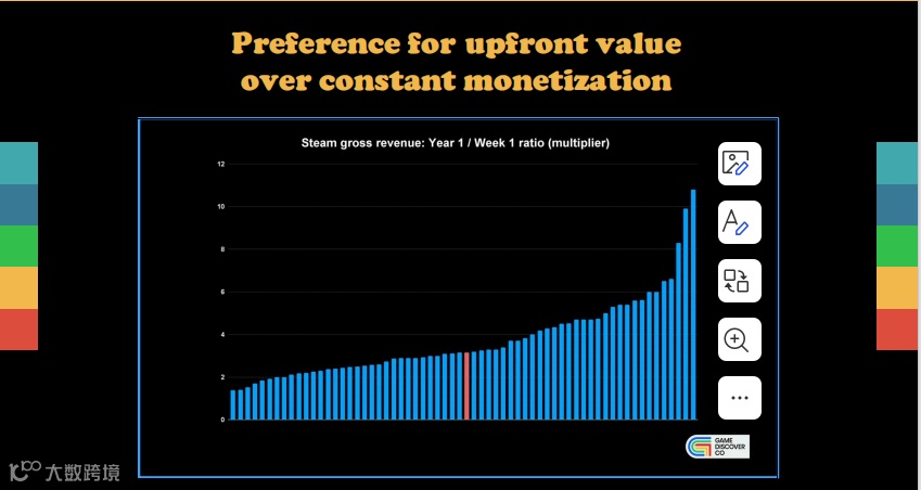 从营销层面看,买断制商业模式在中长期预算上面临的挑战更少,因为大部分营销成本都集中在产品上线前后。在理想情况下,投入资金能够在上线后3到9个月内回收,后续则进入相对可观的长尾收入阶段。对于买断制游戏而言,在正式发售之前,有一个关键指标会吸引发行商的关注,那就是愿望单数量,不同品类从愿望单转化为销量的平均值大约是10%。