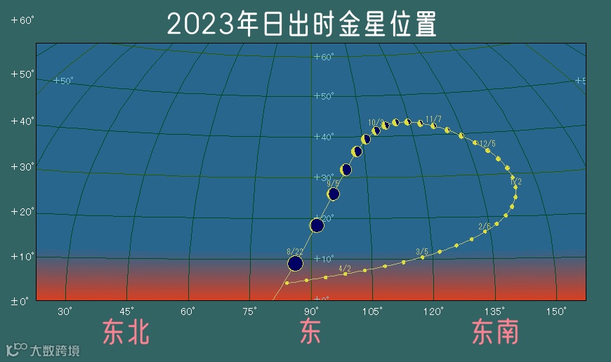 西大距(西方最大离角)是指内行星最远离太阳西侧。所以大距(最大离角)的时候很容易看到。虽说如此,金星与水星相比,离角大,而且亮度也很明亮,所以没有必要那么在意最大离角的日子。从日出时刻金星位置变化的图来看,西大距前后高度超过40度。以晨星的方式出现在星空之中,所以金星也被称为启明星。早起的朋友们可以在黎明前的东南方天空找一下那颗璀璨的明星。