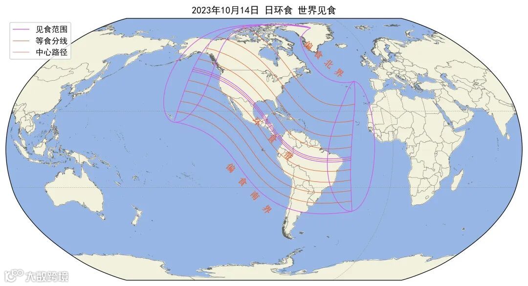 2023年10月15日(北京时间,当地时间14日),地球上将会上演一次壮观的日环食天象发生日环食,环食带从太平洋东北部开始,阿拉斯加南部海面出现,然后一路往东南方移动,从西北到东南贯穿美洲大陆,经过美国、墨西哥、伯利兹、洪都拉斯、尼加拉瓜、巴拿马、哥伦比亚、巴西,最后在大西洋西部结束。最大食分为0.952,环食带宽度约184至245千米,环食阶段持续时间约5分钟。在北美洲(除极西部和极东北部)、南美洲(除南部)、太平洋东部、大西洋(除北部和东南部)、非洲极西部可以看到偏食。与此同时,从北美洲到南美洲的大范围内可以看到日偏食。在我国完全看不到。