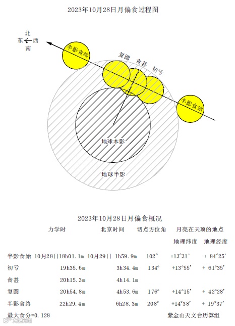 此次月偏食发生在29日凌晨,半影食始从2:00开始,3:34初亏,4:14食甚,4:54复圆,6:28半影食终,整个过程持续约4个半小时。初亏到复圆持续约1小时20分。届时,月亮将擦着地球本影的北边而过,进入本影的最大部分只占月亮视直径的12.8%;从观测者视角来看,阴影将位于月亮的左边缘。我国全境都可以看到这次月食从初亏到复圆的全过程。