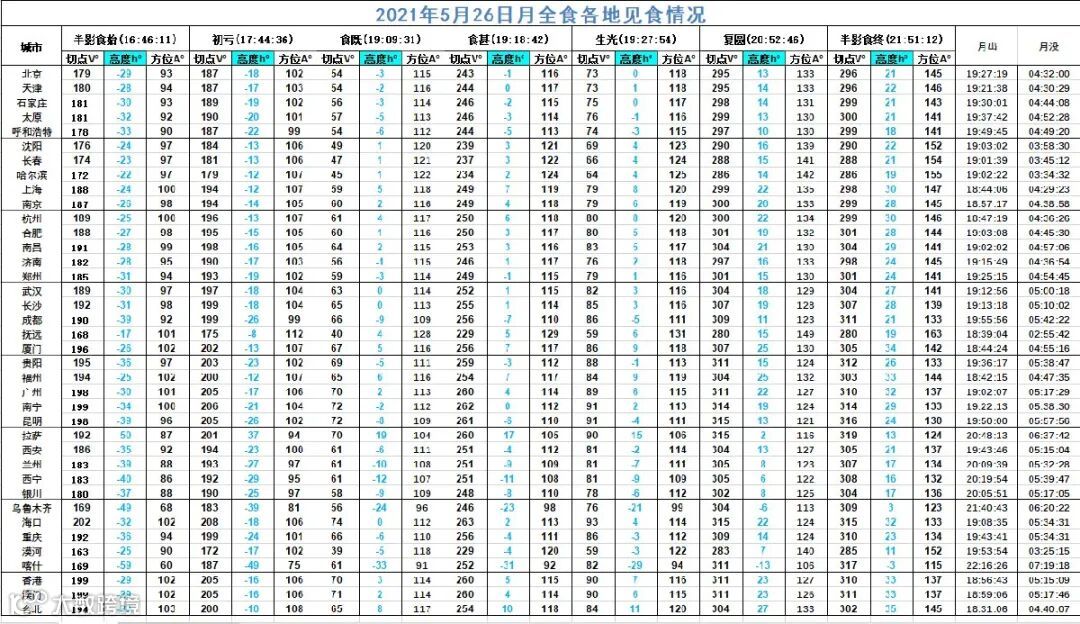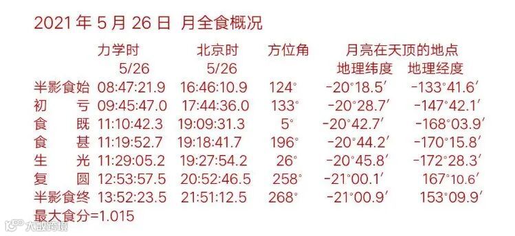 5月26日月全食各阶段发生的北京时间分别是半影食始16时46分,复圆20时53分和半影食终21时51分。19时09分,月亮完全进入地球本影,因阳光经地球大气层的折射和散射,只有少量波长较长的红黄色光可以穿透大气层照射在月亮上,使得市民能在全食阶段看到一轮红色的月亮。