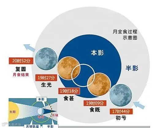 月全食的过程分为初亏、食既、食甚、生光、复圆五个阶段。