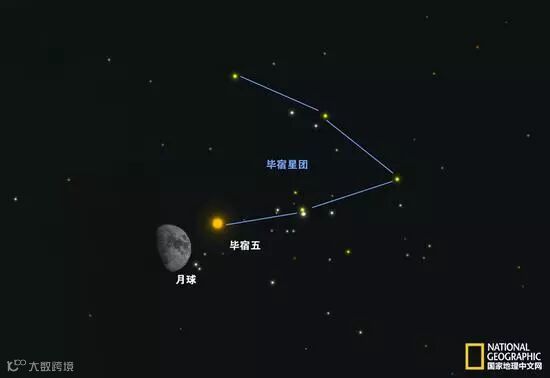 橘红色的毕宿五是金牛座的主星,整个金牛头部大致呈现V字形,毕宿五在V的其中一边上,被视为独眼金牛那只尚完好的眼睛。由于毕宿五就在月球白道附近,所以有的时候,月球甚至会直接从毕宿五前方通过而形成“月掩毕宿五”的景象。