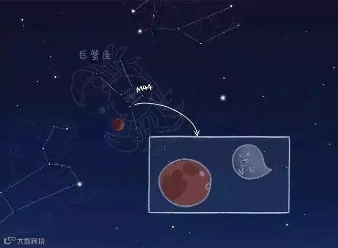 当月球接近巨蟹座的M44(NGC 2632,中文名鬼星团,又称蜂巢星团 )时,我们就称之为月合鬼星团,天文爱好者凭借小型天文望远镜就能目睹到鬼星团与月亮“约会”的神秘色彩。