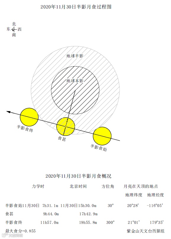 本次半影月食自北京时间15时30分半影食始、19时56分半影食终。全部过程历经4小时又26分钟,我国各地仅能见到月出后的部分过程。本次半影月食食甚发生于17时43分,最大半影食分为0.855。