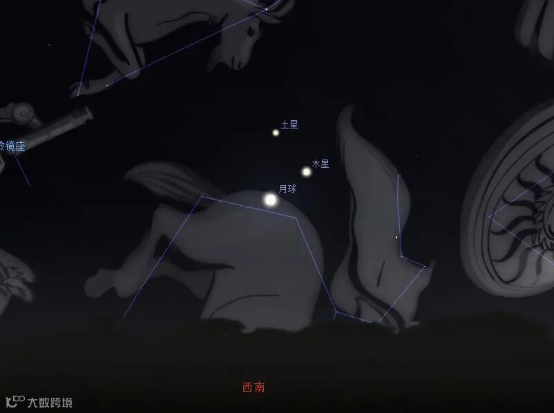 由于今年木星和土星里的很近,所以月亮几乎每个月都会接近木星和土星一次,二木土双星合月的天象与11月19日会再次上演,这一次三者在视野上距离更接近了,将会引人注目。首先是16:56木星合月,木星在月球以北2.5度;之后22:51土星合月,土星在月球以北2.9度。当晚,公众可在日落后朝西南方向观看,便可观赏到蛾眉月悬挂西南低空,而-2等的木星在月亮的右上角,+0.6等的土星在月亮的左上角,形成“双星拱月”之势,像歪着嘴的笑脸!如果用视野7度的双筒望远镜可以同时看到3个天体。而到了19时左右位置会变得很低,因此,应该尽早观察。另外,木星和土星于下个月相合,角距仅0.1度,这将是木土双星时隔20年的超大接近!