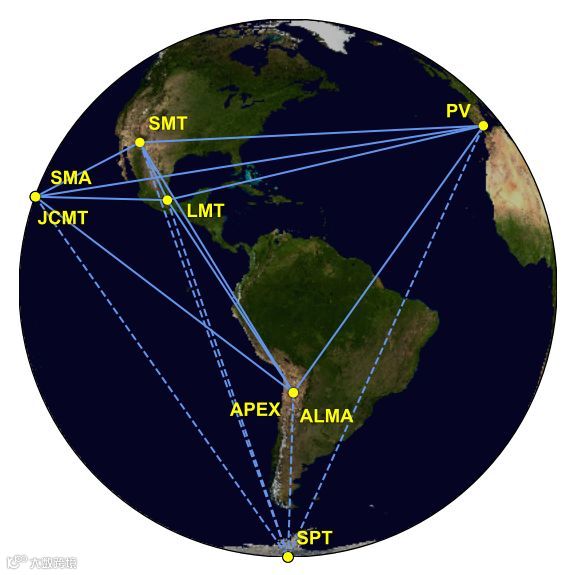 这项观测是天文学家利用一台“地球大小的望远镜”完成的,所谓“地球大小的望远镜”是由分布在全球的八座天文台最先进的射电望远镜组成的一个巨型天文观测网络,它被称为“事件视界望远镜”(英文简称 EHT)。组成EHT的八座射电望远镜分别为: