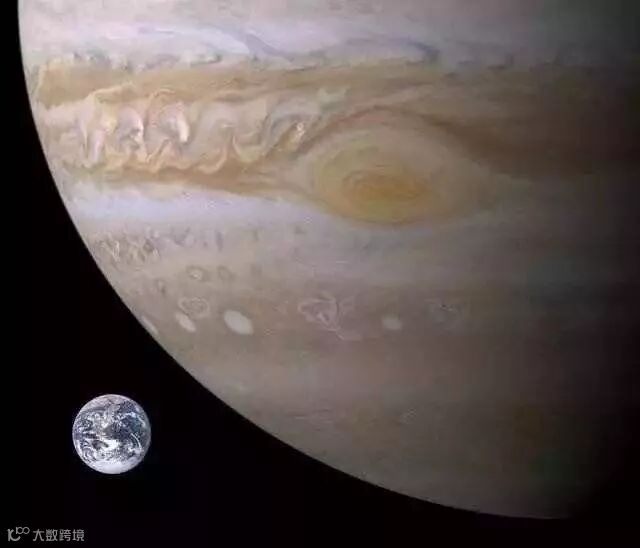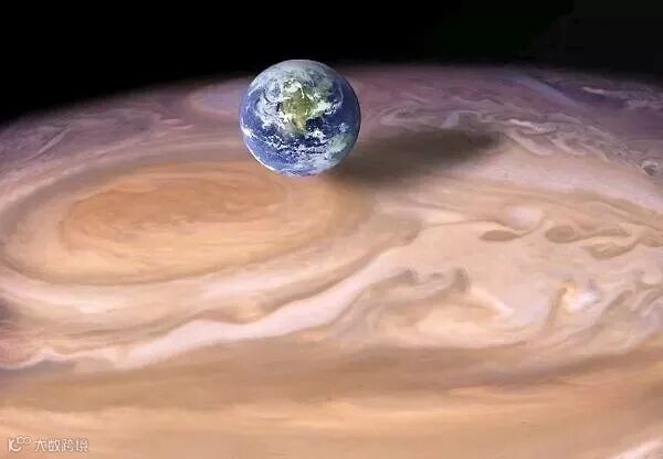 大红斑实际上是木星最大的风暴气旋,它可以并排塞进去4个地球!下面是地球和大红斑的对比,我们可以感受到地球的渺小。