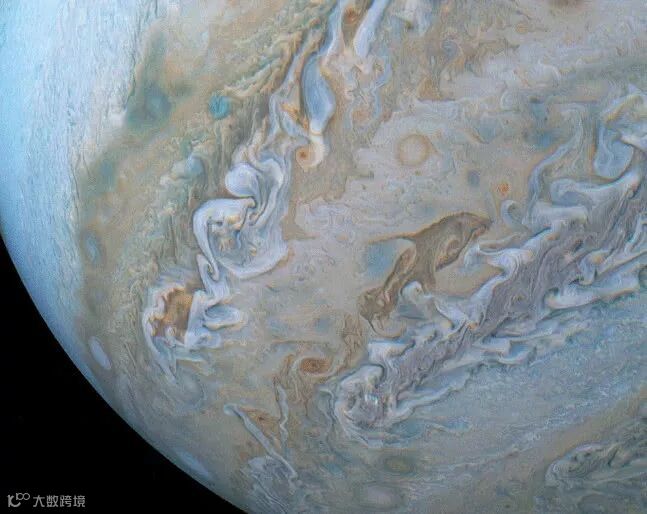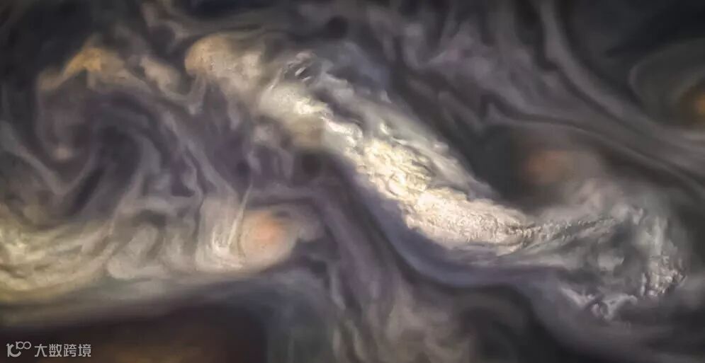 下面是美国航空航天局的朱诺号抓拍的一朵高纬度木星云带。