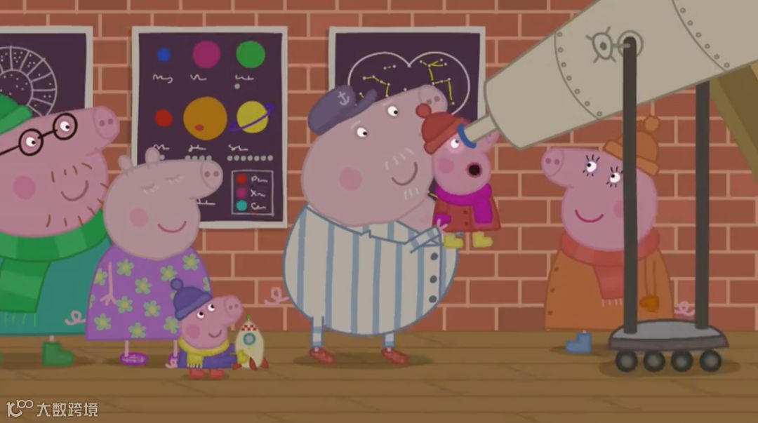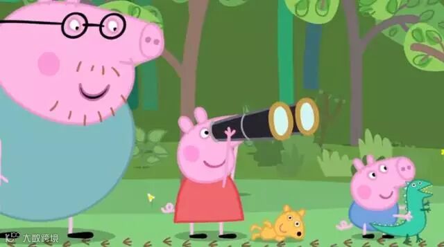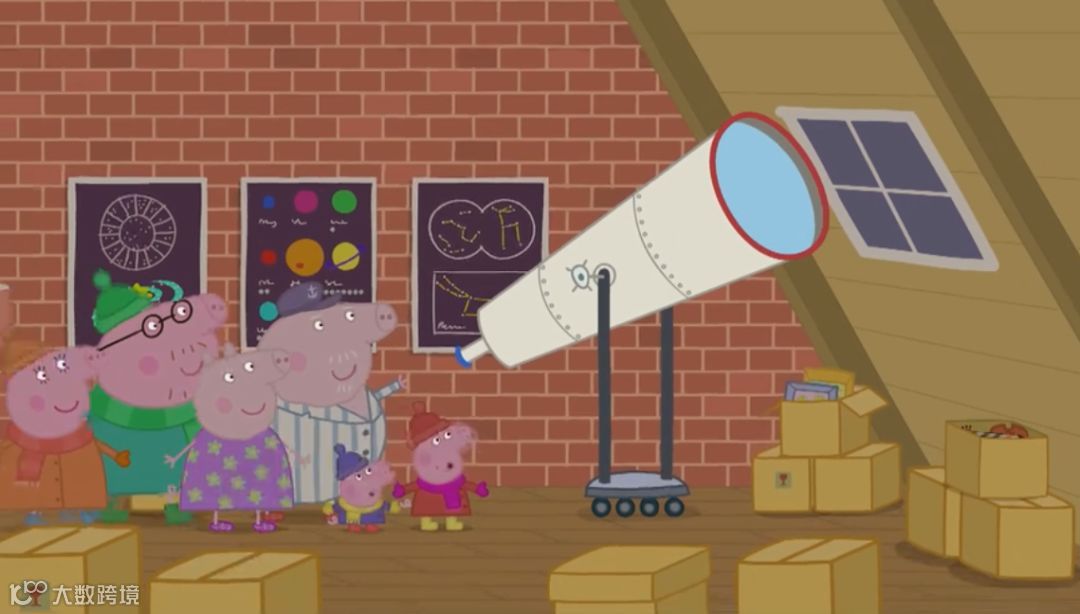 旁白里说,这是佩奇和乔治第一次在晚上外出,作为孩子,他们一定觉得很新奇很开心。小猪佩奇迫不及待的用猪爷爷的望远镜看向了夜空。