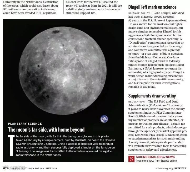 2月15日,最新一期《科学》(Science)杂志第674页刊登了一幅地球和月球的同框照片, 这张照片已在国际主流媒体上广泛传播,外媒甚至评价它是迄今为止最好的地月合影之一。
