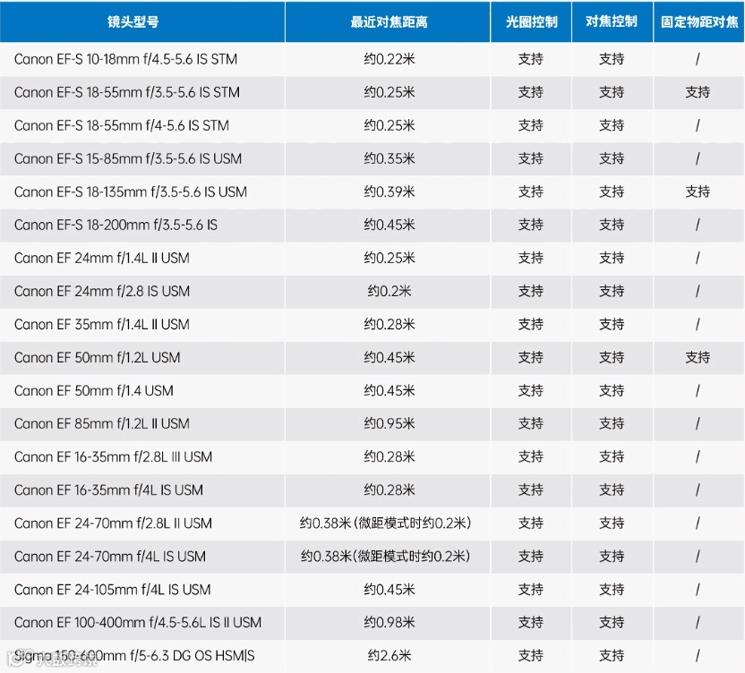 ⚫ 适配各种EF卡口镜头,实现镜头光圈控制/滑动条对焦/自动对焦;