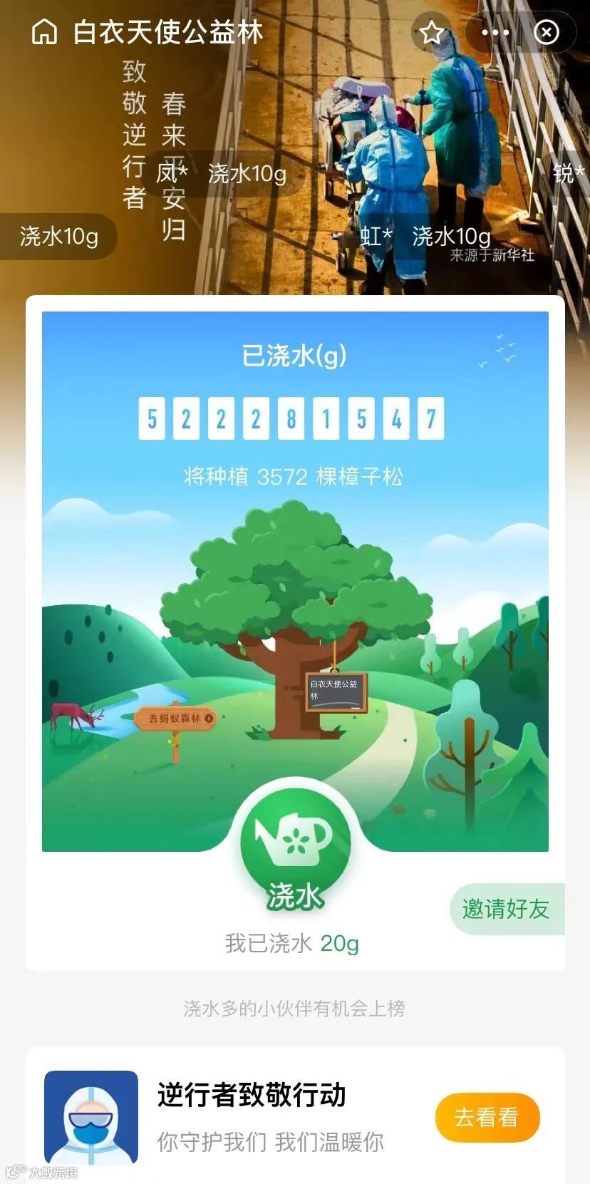 在这场没有硝烟的战役中,无数奔赴在疫情一线的医护人员逆流而上、砥砺前行,他们用生命为我们保驾护航,他们化作吹散阴霾的春日暖风,温情在万家灯火之中。“幸得有你,山河无恙”,为了感谢白衣天使们的付出,通过蚂蚁森林搜索“白衣天使公益林”,积攒绿色能量,一起浇水,种下一棵棵树木,为一线的医护工作者加油!
