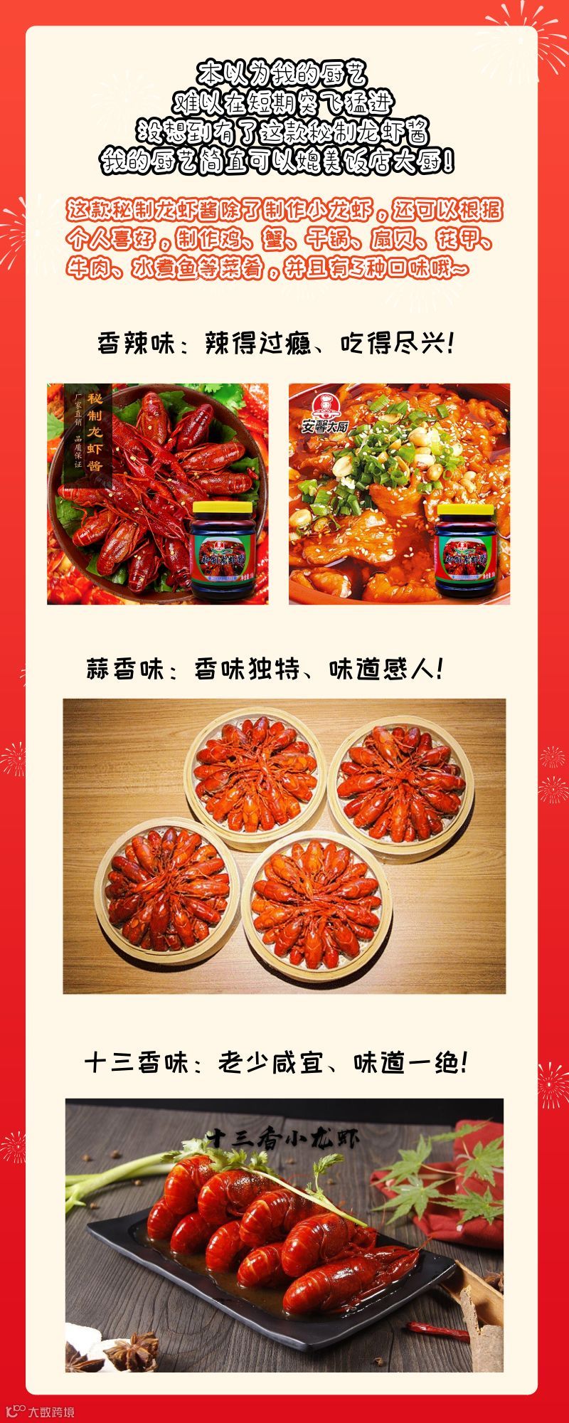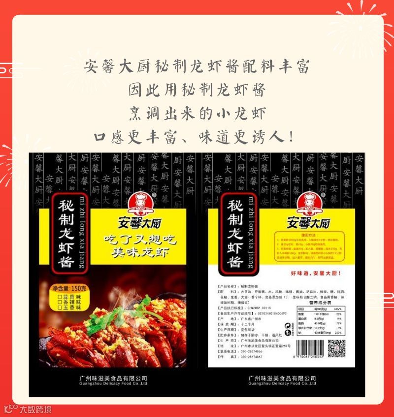 更多资讯,可在淘宝搜索“安馨大厨企业店”或阿里巴巴搜索“广州味滋美食品有限公司”,进入主页后搜索“秘制龙虾酱”,即可获得相关购买信息。