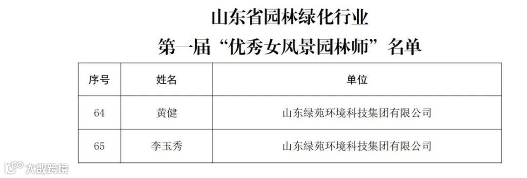 近日,山东省园林绿化行业第一届“优秀女风景园林师”选树宣传活动圆满结束。山东绿苑环境科技集团有限公司两位副总李玉秀、黄健喜提荣誉,获评山东省“优秀女风景园林师”称号。