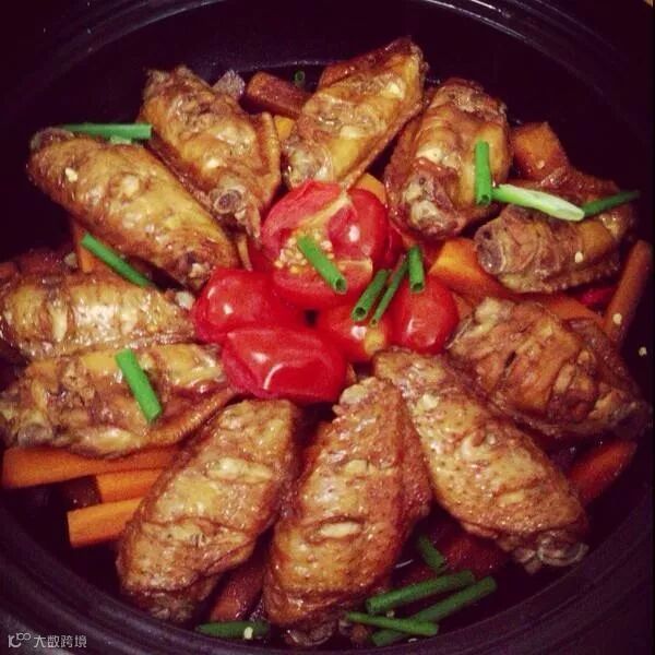 1、将鸡中翅与安馨大厨鸡公煲酱搅拌腌制10分钟。