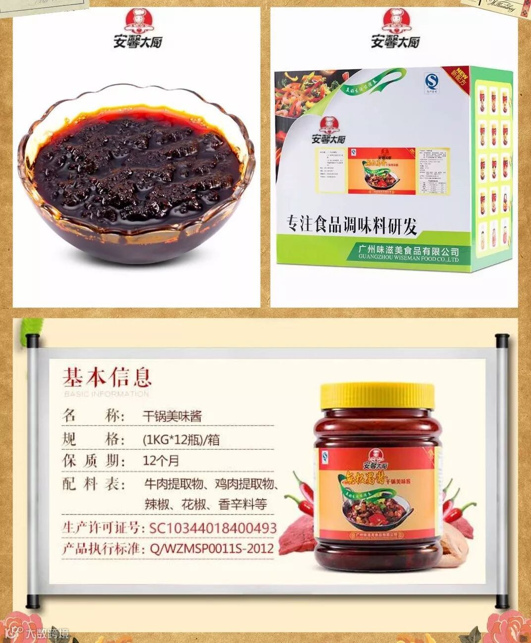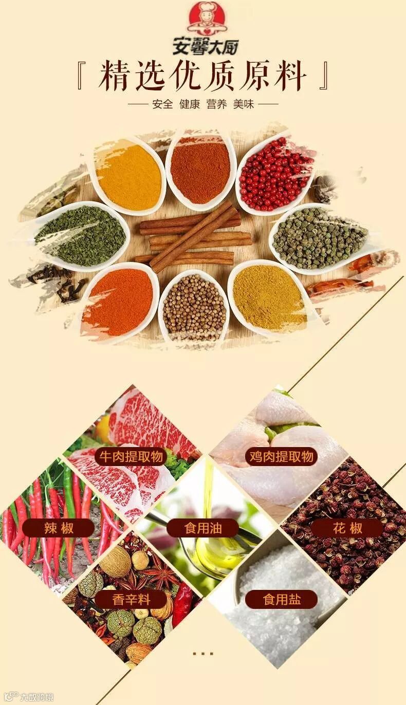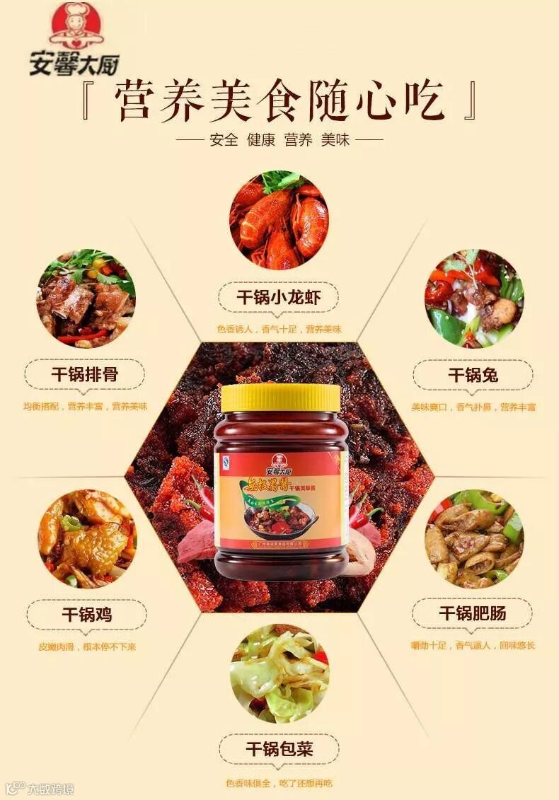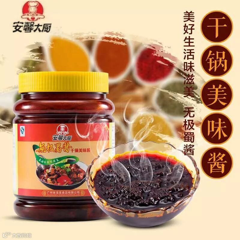 安馨大厨干锅美味酱,采用包括牛肉提取物、鸡肉提取物、香辛料、辣椒、花椒等多种精选有优质原料精制而成,保证绝对安全、健康、营养、美味。