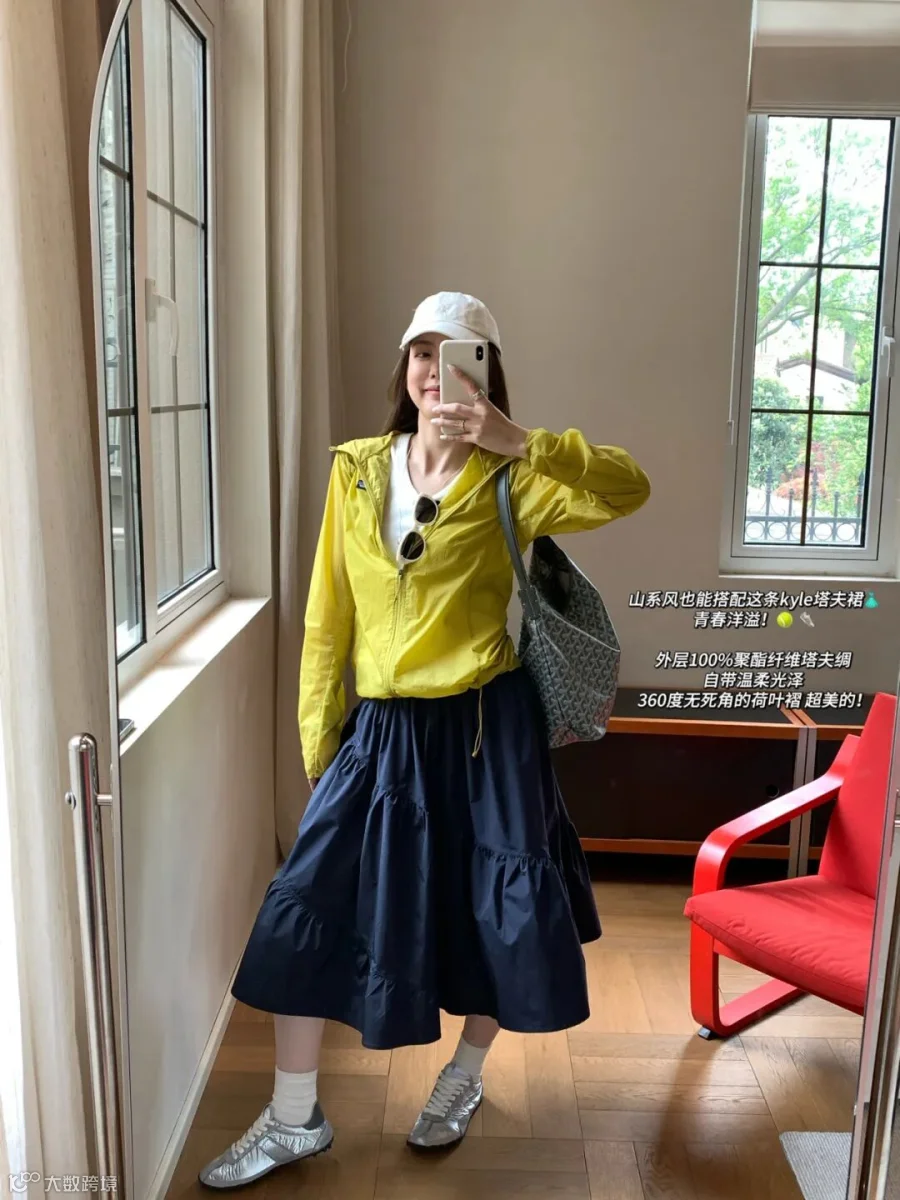 外层100%聚酯纤维塔夫绸 里衬100%棉,外层面料自带高级哑光光泽感的材质,摸起来顺滑挺括 不容易皱 垂感超绝!挺括感能撑起裙子的大摆造型。但风吹起来裙摆又飘逸灵动 拍照巨出片~