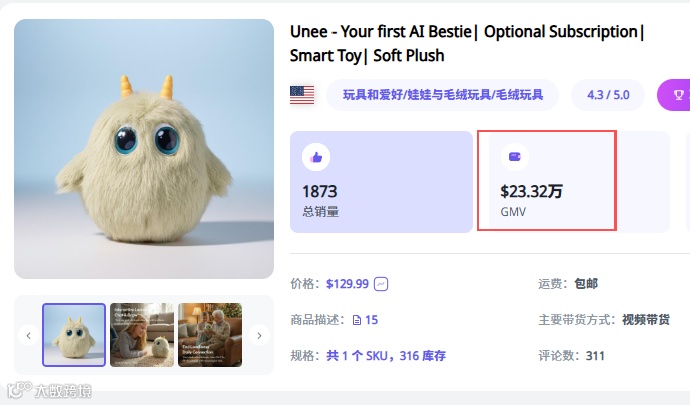 在 TikTok 美区,普通毛绒玩具大多停留在几十美元价位,而 Unee 的 AI 毛绒伴侣玩具,定价直接锁定在129.99 美元,折合人民币接近千元,却依然成为爆款。