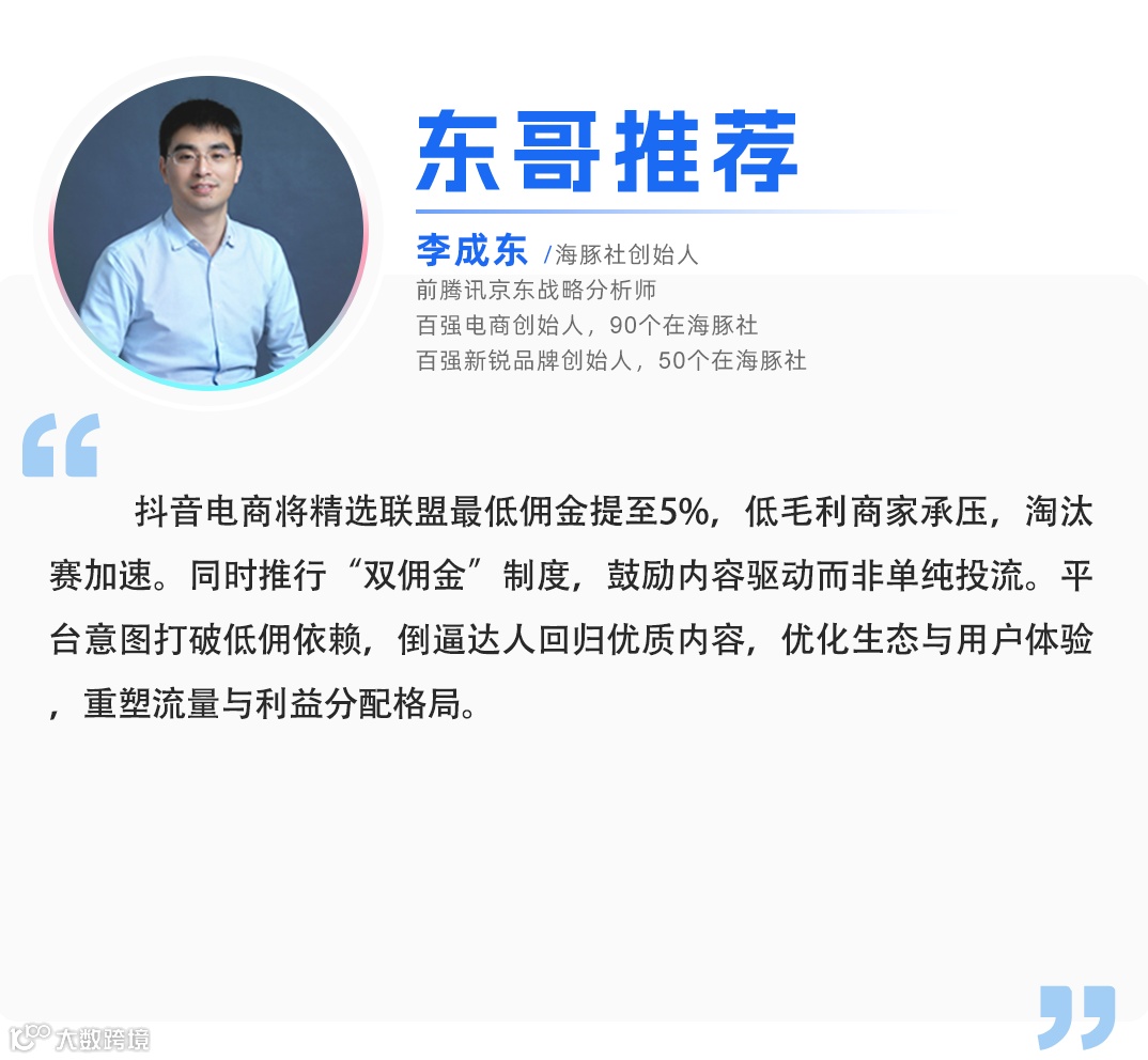 从提高最低佣金率,到双佣金制度全面落地,一系列政策与流量机制调整本质是平台希望通过规则重构,倒逼达人、商家回归内容创作,最终达成扶持中小达人成长、优化平台生态和用户体验的目的。