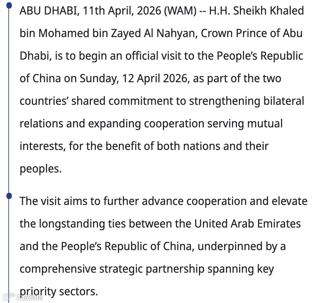根据阿联酋官方通讯社发布的消息,阿布扎比王储谢赫·哈立德将于4月12日对中国进行正式访问。